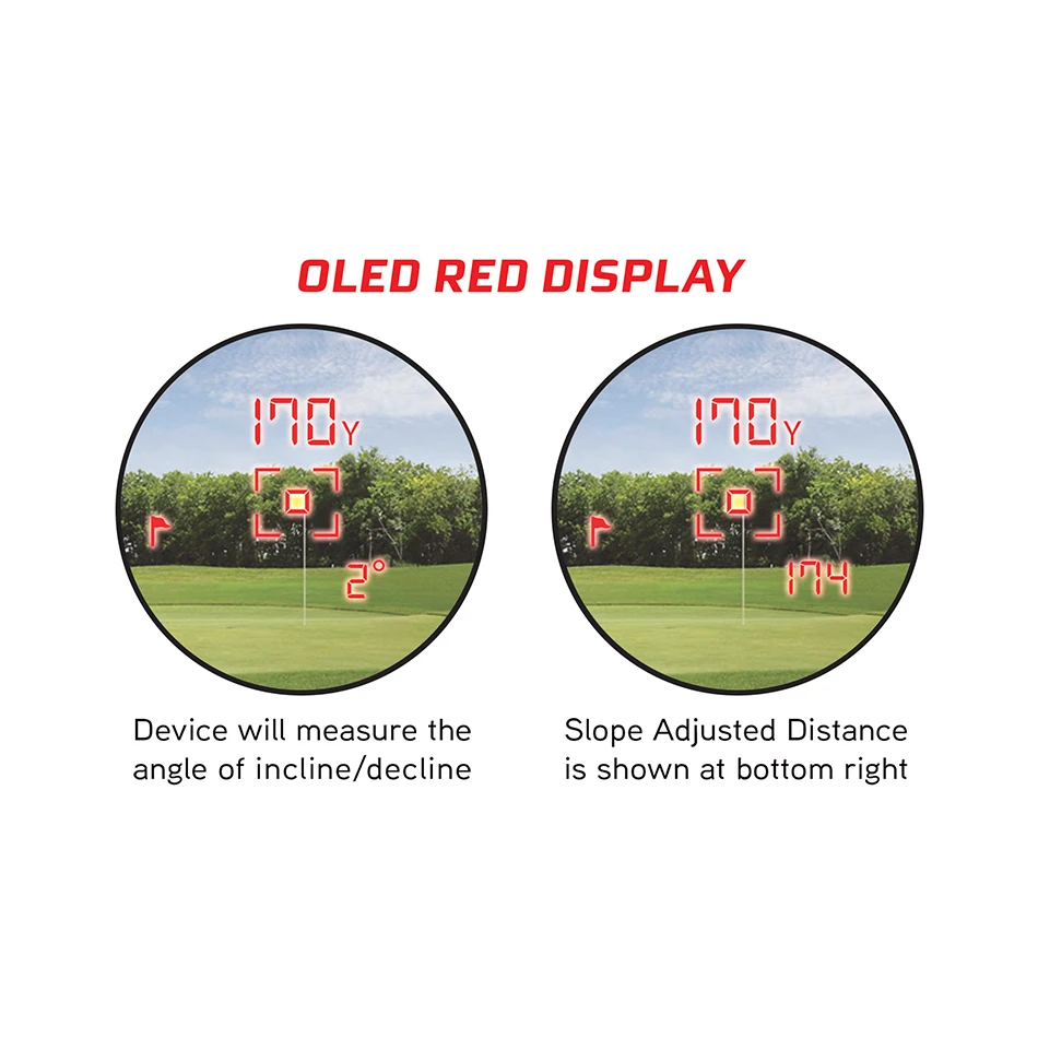 - Slope Technology: Device measures angle of incline/decline then calculates the slope adjusted distance (side button to turn on/off)